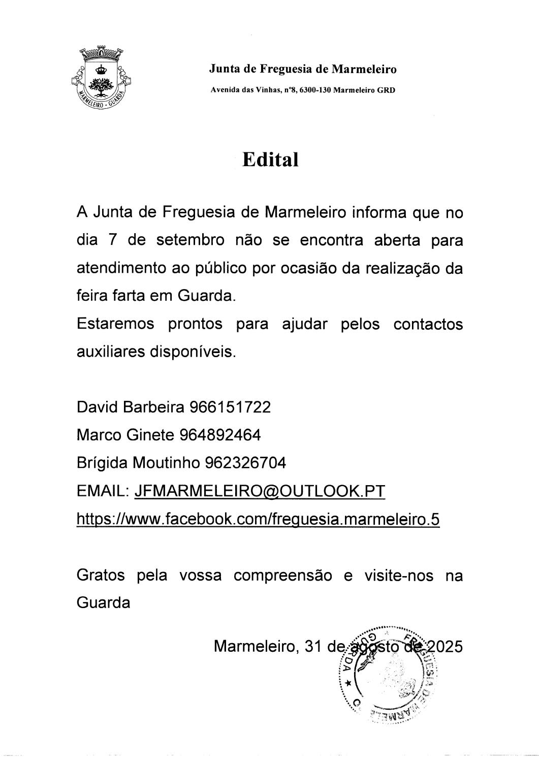A Junta de Freguesia de Marmeleiro informa que no dia 7 de setembro não se encontra aberta para atendimento ao público por ocasião da realização da feira farta em Guarda.